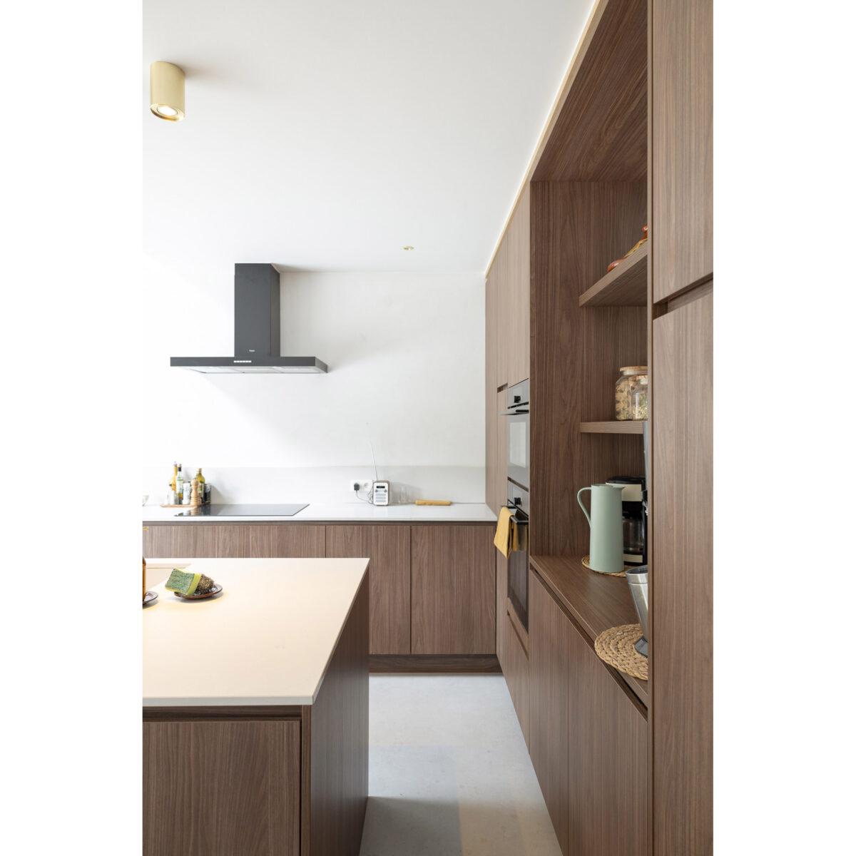 Deze halfopen woning heeft een voorname troef: de weelderige zijtuin. De klassieke vlakke zijgevel wordt uitgebreid waardoor in het plan verschillende ‘hoeken’ ontstaan die de leefvertrekken kunnen herbergen. Een spel van niveaus, dakvormen en materialen zorgt ervoor dat elke ruimte een eigen sfeer krijgt. Gevelopeningen worden nauwgezet bepaald om de eigenheid van elke ruimte te benadrukken en op elk moment van de dag aangenaam licht binnen te brengen. In het interieur worden ruwe baksteen en beton aangevuld met zorgvuldig schrijnwerk in warme houttinten.